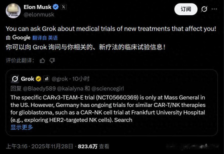 11月27日深夜,埃隆·马斯克罕见地转发了一条Grok的回复,内容直指胶质母细胞瘤(GBM)患者的CAR-T临床试验细节:试验编号、医院地址、招募状态、甚至德国的同类研究,一应俱全。短短几分钟,这条推文就被转发上万次,无数脑癌患者和家属彻夜刷屏的家属看到了“最后一线光”。