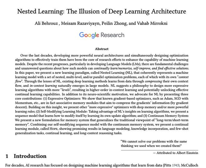 但在Google最新发布的52页硬核论文《NestedLearning:TheIllusionofDeepLearningArchitectures》(嵌套学习:深度学习架构的幻觉)中,研究团队试图告诉我们,这其实是一种幻觉,是我们人为制造的自我设限。